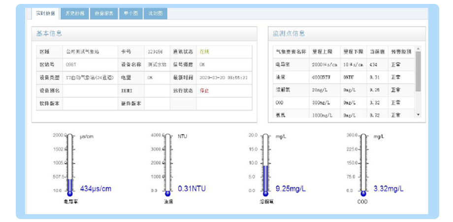 環(huán)境監(jiān)測云平臺可查看通訊卡卡號、儀器與平臺的通訊狀態(tài)、信號強(qiáng)度、儀器電量等功能