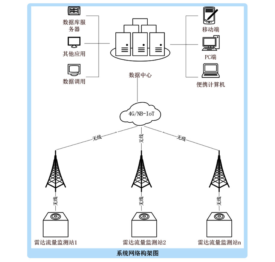 雷達(dá)流量監(jiān)測系統(tǒng)是以流量監(jiān)測儀器為核心,運(yùn)用現(xiàn)代傳感技術(shù)、自動測量、自動控制技術(shù)、計算機(jī)應(yīng)用技術(shù)和通訊網(wǎng)絡(luò)等組成的綜合性在線自動監(jiān)測系統(tǒng)。本系統(tǒng)主要由:雷達(dá)流量傳感器、數(shù)據(jù)處理主機(jī)、數(shù)據(jù)傳輸系統(tǒng)、應(yīng)用層等部分組成。傳感部分是信息化的基礎(chǔ),主要實(shí)現(xiàn)城區(qū)水雨情采集和排水過程監(jiān)測監(jiān)控;測量主機(jī)主要實(shí)現(xiàn)站點(diǎn)編輯、斷面輸入、各類數(shù)據(jù)匯集、存儲、管理和計算;遠(yuǎn)程傳輸系統(tǒng)主要是通過RTU所進(jìn)行的數(shù)據(jù)傳輸功能,對所關(guān)心的數(shù)據(jù)進(jìn)行上傳至數(shù)據(jù)中心;應(yīng)用層在信息資源中心的基礎(chǔ)上提供綜合信息服務(wù)、工程運(yùn)行維護(hù)管理和信息展示等功能,為明渠流量信息化提供科學(xué)依據(jù)。