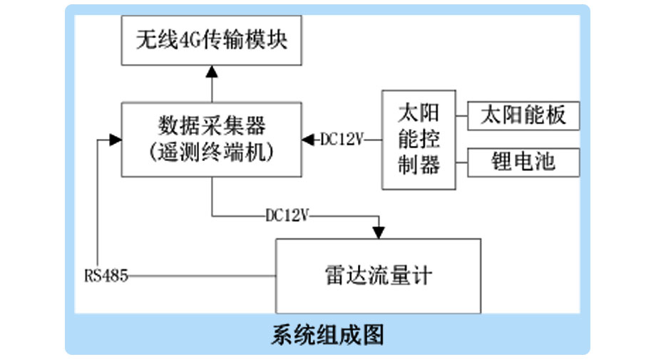 雷達(dá)式流量監(jiān)測系統(tǒng)由下至上分為數(shù)據(jù)采集單元、數(shù)據(jù)處理單元、數(shù)據(jù)傳輸單元和監(jiān)控中心數(shù)據(jù)服務(wù)平臺組成。由雷達(dá)流量計測量流體的流速、水位等數(shù)據(jù),結(jié)合斷面參數(shù)計算出斷面流量;遙測終端機(jī)(RTU)將數(shù)據(jù)通過GPRS/4G/NB-IoT無線網(wǎng)絡(luò)通訊技術(shù)傳輸至流量監(jiān)測中心,監(jiān)測中心可實(shí)時對現(xiàn)場數(shù)據(jù)可視化監(jiān)測,實(shí)現(xiàn)系統(tǒng)運(yùn)行無人值守、有人管理的模式。如下圖: