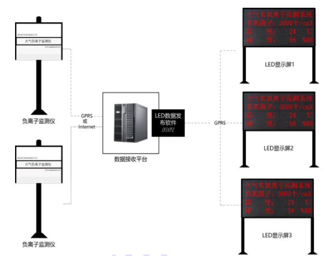 負氧離子監(jiān)測儀將監(jiān)測到的負氧離子濃度、顆粒物、溫濕度數(shù)據(jù),通過GPRS傳輸網(wǎng)絡(luò)經(jīng)過Internet發(fā)送到接收數(shù)據(jù)的服務(wù)器上,并且自動將數(shù)據(jù)保存并寫入數(shù)據(jù)庫,客戶端可以通過瀏覽器查看數(shù)據(jù)等。用戶可以通過接收軟件和短信控制的方式監(jiān)控負氧離子監(jiān)測儀設(shè)備。