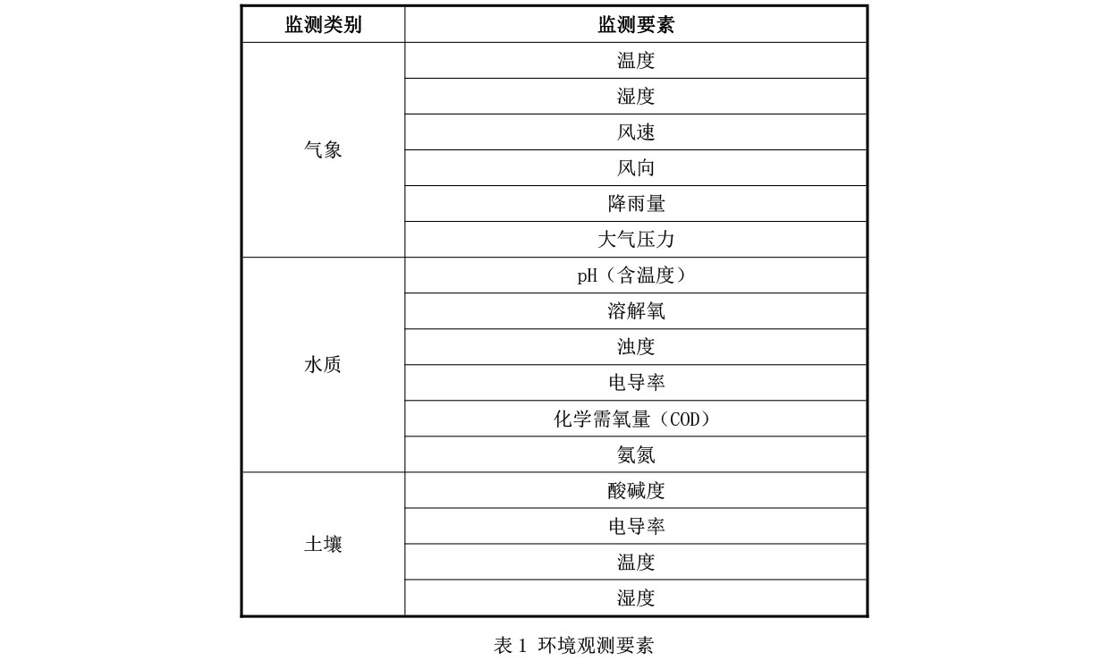 系統(tǒng)將建設(shè)農(nóng)業(yè)環(huán)境在線監(jiān)測(cè)系統(tǒng),農(nóng)業(yè)環(huán)境觀測(cè)數(shù)據(jù)收集處理與應(yīng)用分析平臺(tái)以及配套的網(wǎng)絡(luò)體系和軟硬件設(shè)施。具體設(shè)備類型和設(shè)備數(shù)量根據(jù)實(shí)際情況和業(yè)務(wù)需求可靈活配置,監(jiān)測(cè)項(xiàng)目如下表所示。