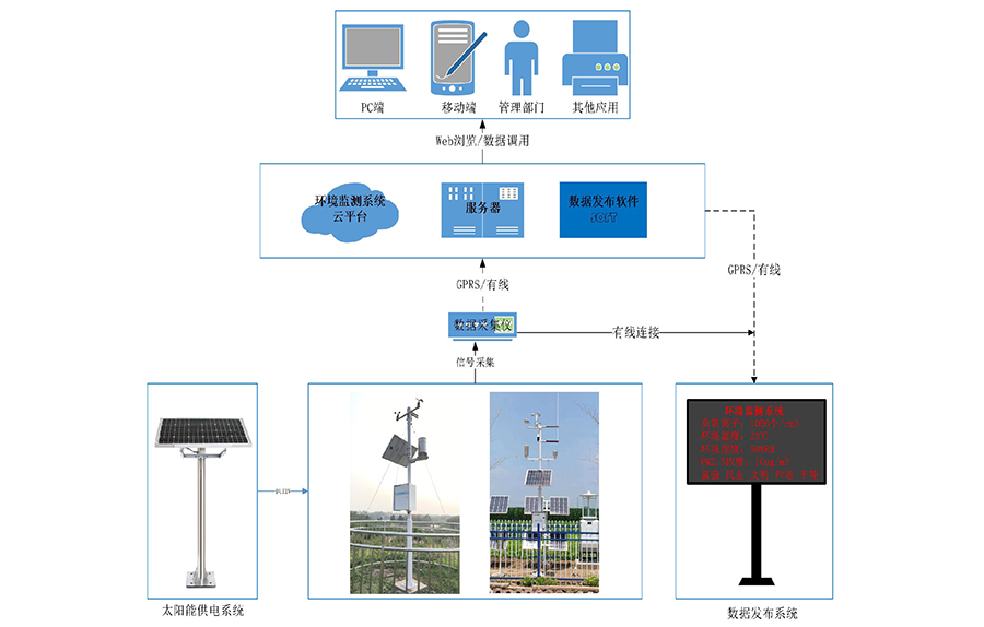在線氣象環(huán)境監(jiān)測系統(tǒng)是主要針對區(qū)用戶的一種實用型的自動監(jiān)測系統(tǒng),它是將農(nóng)業(yè)、林業(yè)、景區(qū)等場所的風(fēng)速、風(fēng)向、雨量、空氣溫度、空氣濕度、光照強度等環(huán)境質(zhì)量參數(shù),通過自動監(jiān)測設(shè)備實時監(jiān)測,將監(jiān)測數(shù)據(jù)通過GPRS等方式傳輸?shù)骄W(wǎng)絡(luò)監(jiān)控軟件平臺、LED顯示屏、PC端、手機APP等,直觀、快捷的展現(xiàn)給用戶,并為各功能平臺提供統(tǒng)一服務(wù)入口,實現(xiàn)數(shù)據(jù)監(jiān)測系統(tǒng)信息的發(fā)布和查詢。氣象監(jiān)測系統(tǒng)由氣象傳感器、氣象數(shù)據(jù)采集儀、電源系統(tǒng)、全天候防護箱、LED顯示屏、環(huán)境監(jiān)測云平臺等部分構(gòu)成??蓪︼L(fēng)速、風(fēng)向、雨量、空氣溫度、空氣濕度、光照強度等氣象要素進(jìn)行全天候現(xiàn)場監(jiān)測。